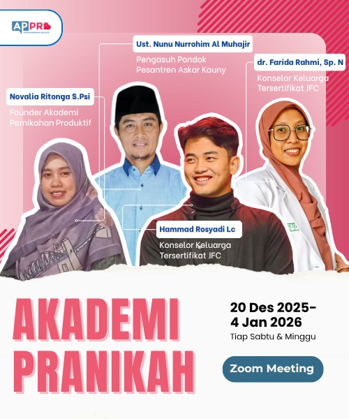 Mulai sadar bahwa cinta saja tidak cukup untuk membangun rumah tangga? Itu tandanya kamu butuh ilmu sebelum menikah. Jangan ulangi kesalahan banyak orang yang baru belajar setelah terluka, ketika hati sudah lelah, komunikasi sudah rusak, dan hubungan sulit diselamatkan. Karena itu hadir Akademi Pernikahan Produktif, program pembekalan pranikah berbasis syariat & psikologi yang membimbingmu mempersiapkan pernikahan matang, terarah, dan diridhai Allah.